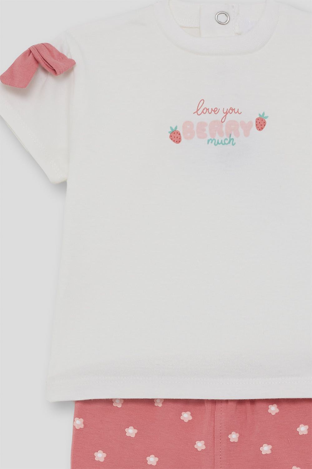 Conjunto infantil ideal para los días de buen tiempo, formado por camiseta blanca de manga corta con delicados lazos en los hombros y bonito estampado frontal, combinado con leggings pirata en tono rosa empolvado con pequeño dibujo floral.