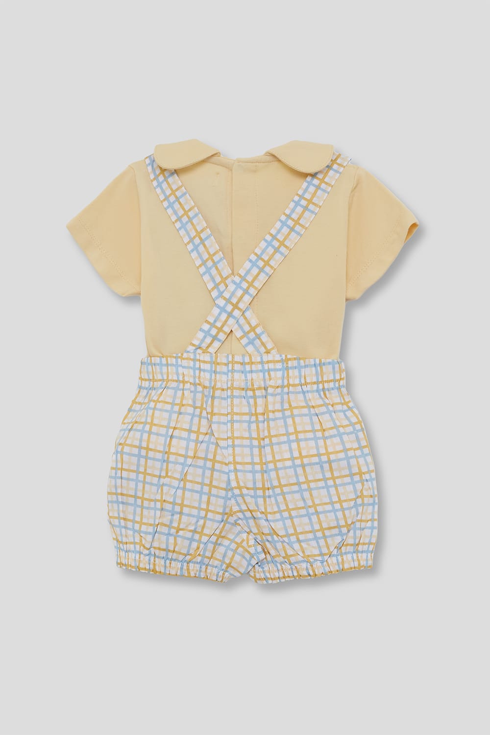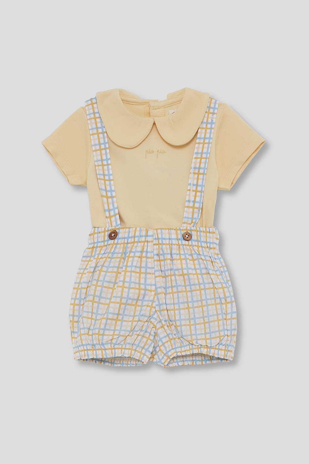 Conjunto de dos piezas, camiseta y ranita para bebé niño. Camiseta en color amarillo con cuello bebé y detalle bordado "pío pío" en el pecho. Ranita de tirantes en tejido de cuadros amarillos y celestes, con botones decorativos y cintura elástica para mayor comodidad.